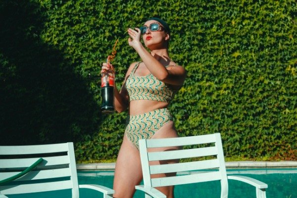 La parte de arriba es un top con escote redondo en frente y espalda, la parte de atras es mas escotada. Tiene breteles de 2 cm de ancho. La bombacha es vedetina tiro alto.